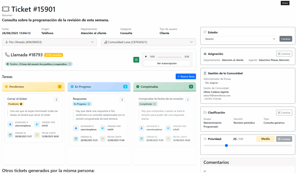 Atiende llamadas de vecinos, resuelve dudas y registra incidencias automáticamente, sin esperas ni desvíos. Disponible 24/7 con voz natural y lenguaje adaptado.